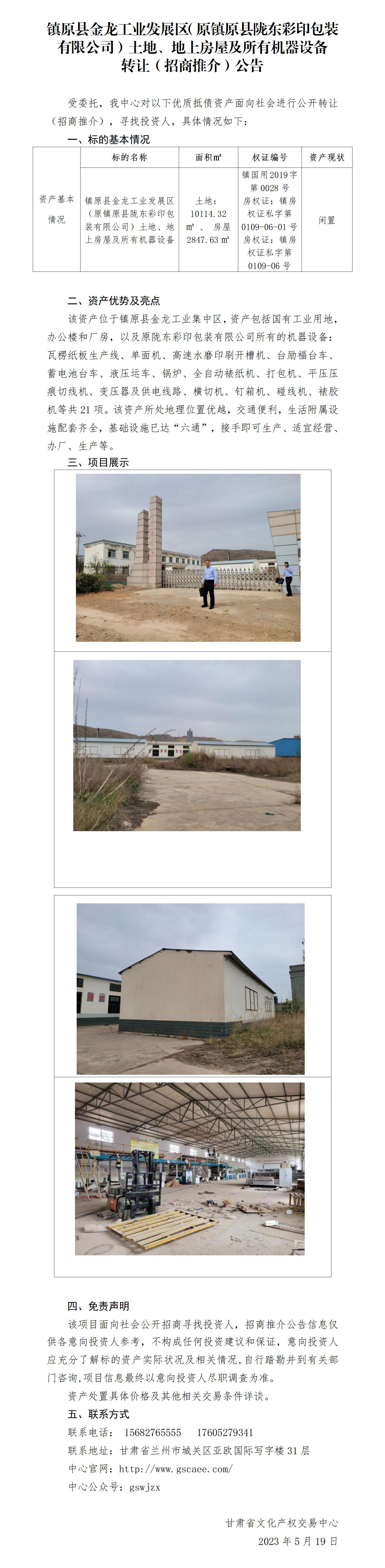 庆阳市镇原县金龙工业发展区(原镇原县陇东彩印包装有限公司)土地、地上房屋及所有机器设备 转让(招商推介)公告
