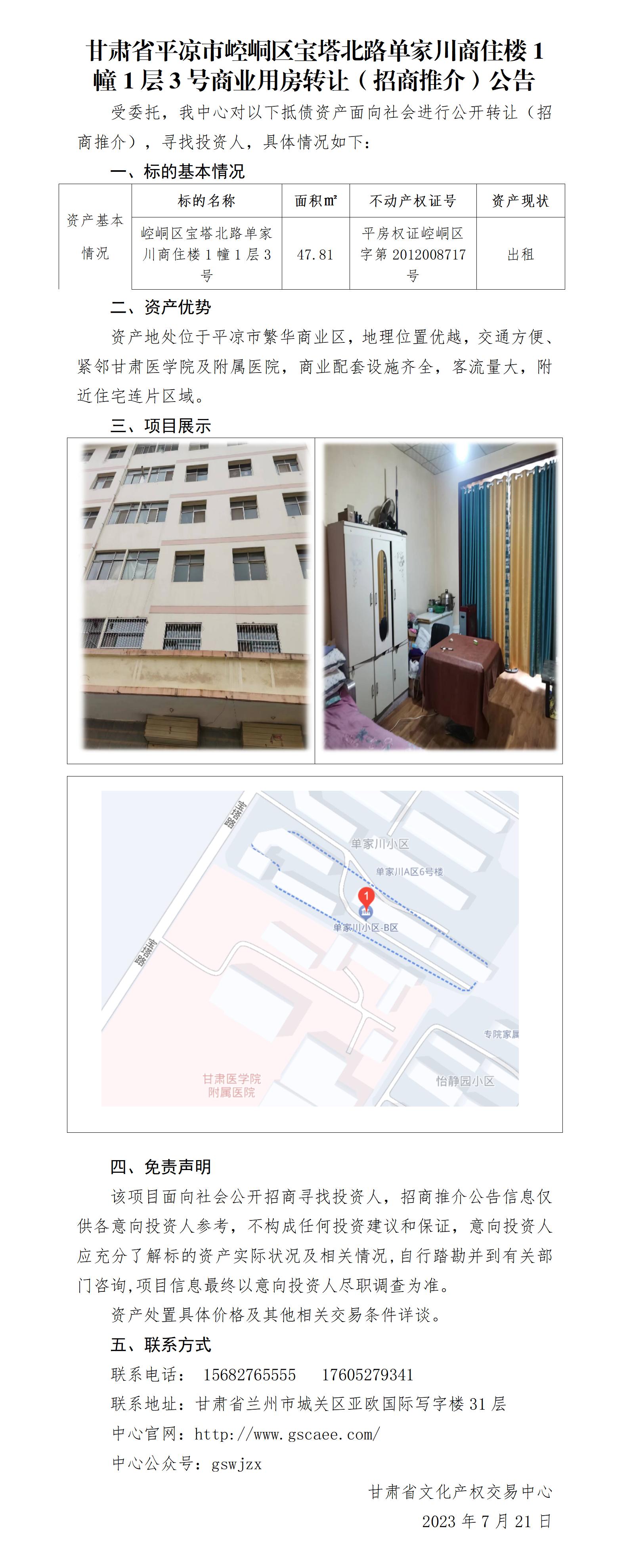 甘肃省平凉市崆峒区宝塔北路单家川商住楼1幢1层3号商业用房转让(招商推介)公告